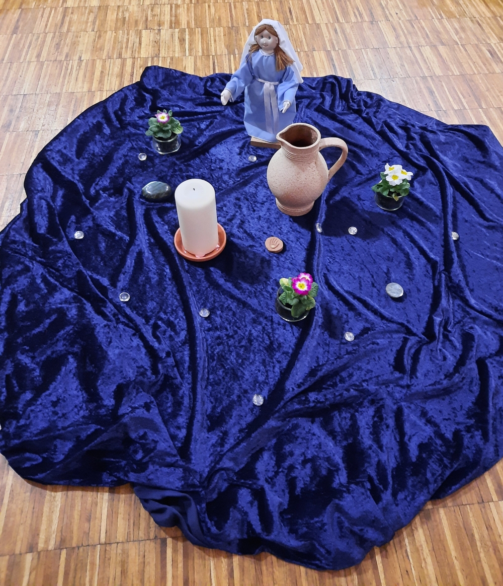 Unter der Leitung von Anja Leuwer SMDB wurde das Thema in 4 Schritten angegangen. Unsere gestaltete Raummitte zeigte: Maria, die Mutter Jesu, einen Krug mit dem Wasser des Lebens und eine Kerze als Symbol für Jesus.